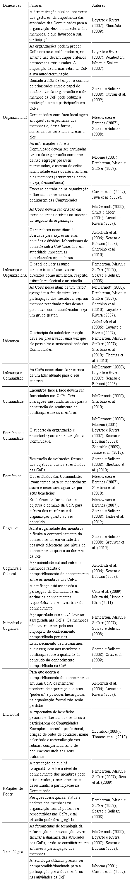 A importância despendida pelos autores aos fatores da aludida dimensão justifica-se pelo grau de interferência que eles podem exercer na dinâmica das Comunidades. As discussões são estabelecidas a partir de Loyarte e Rivera (2007) e Zboralski (2009) quando afirmam que a demonstração pública, por parte dos gestores, da relevância das atividades dos ambientes comunitários para a organização favorece as participações dos membros. Ainda Loyarte e Rivera (2007) e Pemberton, Mavin e Stalker (2007) declaram que as organizações podem propor CoPs aos seus colaboradores, no entanto não devem impor critérios e processos estruturados. Scarso e Bolisani (2008) e Curran et al. (2009) identificam que o conflito de prioridades entre o papel de colaborador da organização e o de integrante da CoP, somado à falta de tempo, pode reduzir a motivação relativa à participação em tais grupos. Congruentemente, Meeuwesen e Berends (2007) e Scarso e Bolisani (2008) sustentam que as Comunidades com foco local aumentam os benefícios diretos aos membros. Moreno (2001) e Pemberton, Mavin e Stalker (2007) concordam que as informações sobre a Comunidade devem ser divulgadas dentro da instituição, como meio de não segregar possíveis interessados, e mesmo de evitar animosidade entre os não membros e os membros. Curran et al. (2009) e Jiwa et al. (2009) acordam em declarar que o excesso de trabalho na organização influencia para que os membros declinem das Comunidades. Por fim, McDermott (2000), Smits e Moor (2004) e Loyarte e Rivera (2007) consideram que estas devem ser criadas em torno de temas centrais ao sucesso do negócio da organização.