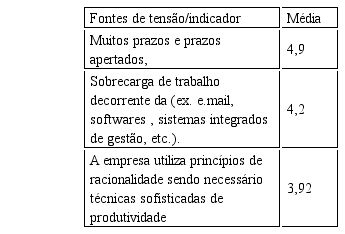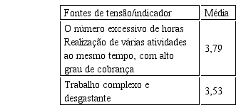 Quando na Tabela 2; a média de 3.79 dos gerentes aponta que o número excessivo de horas e a realização de várias atividades ao mesmo tempo, com alto grau de cobrança são importantes fontes de tensão, que apontou uma tensão mediana nessa empresa.