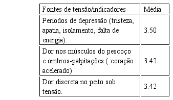 A Tabela 1 evidencia fontes que indicam tensão de fato no trabalho dos participantes da pesquisa, sendo que o valor de 3,92 foi considerado nessa tabela, por estar mais próximo ao valor 4,00, que é de acordo com o crivo, um valor relativo à tensão de fato considerando fatores intrínsecos ao trabalho; papel gerencial nas organizações, clima e estrutura organizacional e interrelacionamento.
