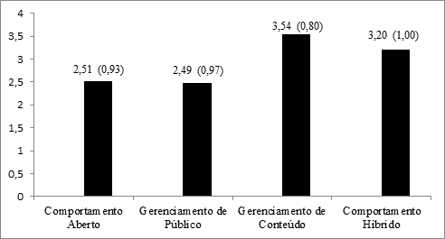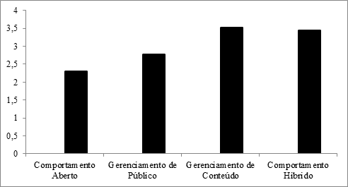 Neste tópico, são apresentados os resultados dos testes de comparação de médias realizados por meio da Análise da Variância (MANOVA), que possibilita avaliar as hipóteses relacionadas às consequências da adoção dos comportamentos Aberto, Gerenciamento de Público, Gerenciamento de Conteúdo e Híbrido para o respeito e a simpatia dos colegas de trabalho. As principais informações estão retratadas nas figuras 2 e 3, a seguir.