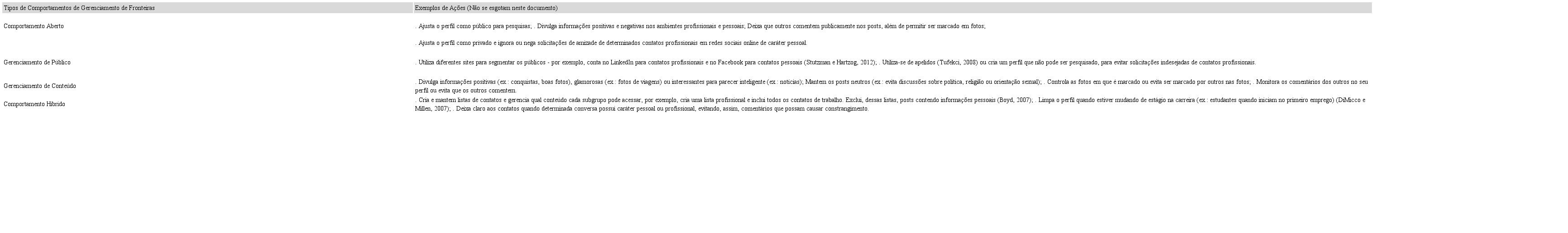 Comportamento de Gerenciamento de Público. Por separar contatos pessoais e profissionais nos ambientes online, ao adotar comportamentos de gerenciamento de público, o indivíduo não intensifica a percepção de seus colegas de trabalho sobre suas competências na função que exerce na empresa (OLLIER-MALATERRE et al., 2013).