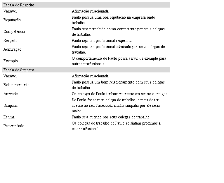 As escalas de medição de respeito e simpatia foram elaboradas com base nos exemplos ilustrativos de comportamentos de gerenciamento de fronteiras nas redes sociais online. Eles foram apresentados nos estudos de Ollier-Malaterre et al. (2013) e referenciados no Quadro 1 deste trabalho. Após a apresentação dos perfis, foi solicitado aos participantes responder dez questões, sendo cinco relacionadas a respeito e cinco relacionadas à simpatia. A construção das escalas de respeito e simpatia tomou como base as definições de Kiesler e Goldeberg (1968), Wojciszke et al. (2009) e Ollier-Malaterre et al. (2013), conforme descrição apresentada no Quadro 2.