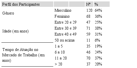 Os dados demográficos demonstraram uma predominância de respondentes do sexo masculino, o que representa 64% da amostra válida (120 participantes), em relação ao público feminino, que representa 36% do total de participantes (68 respostas). A maior concentração de respondentes tanto do gênero masculino quanto feminino se encontra na faixa etária de 30 a 39 anos, com 38% ou 71 respondentes, seguido de profissionais com idade entre 40 a 49 anos, com 31% ou 59 participantes, e 20 a 29 anos, que representam 25% da amostra ou 47 respostas. Com relação ao tempo de atuação no mercado de trabalho, grande parte dos participantes do estudo possui de 11 a 20 anos, com 37% ou 70 respostas, seguido de 6 a 10 anos, com 24% ou 46 respondentes, mais de 20 anos de mercado, com 20% ou 37 respostas e, por fim, de 1 a 5 anos, com 19% ou 35 respondentes. Todas essas informações podem ser identificadas na Tabela 1 da pesquisa.
