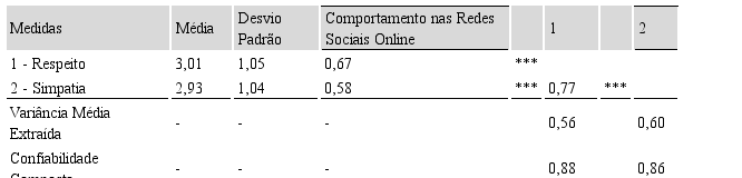 Posteriormente, foi realizada a avaliação da confiabilidade das variáveis latentes, por meio do índice da confiabilidade composta. Nesta pesquisa, foram identificados os valores acima de 0,88 para o constructo de respeito e de 0,83 para o constructo de simpatia, conforme Tabela 3. Um segundo critério para avaliar a confiabilidade ocorre pelo Alfa de Cronbach. Neste estudo, foram encontrados valores acima de 0,80 para o constructo de respeito e de 0,83 para o constructo de simpatia, o que permite confirmar a confiabilidade dos questionários aplicados.
