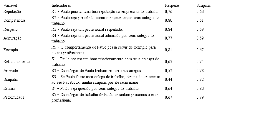 Por fim, ao analisar a validade discriminante, utilizou-se como critério de avaliação a verificação dos valores das cargas fatoriais com os seus respectivos constructos. Essa estimação foi realizada por meio do software SmartPLS. A validade discriminante é caracterizada pela comparação do resultado obtido para o valor do constructo em comparação a outros constructos (CHIN, 1998). No caso deste estudo, este critério foi atendido, uma vez que as cargas fatoriais relacionadas ao constructo de respeito foram mais altas quando comparadas ao constructo de simpatia e vice-versa. Os valores referentes à matriz de cargas fatoriais para os constructos de respeito e de simpatia podem ser observadas na Tabela 4.