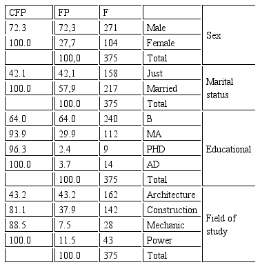In this table, displayed frequency percent, cumulative frequency percent, and qualitative variables (gender, marital, status, educational level and field of study). For example, the frequency of civil engineering 142, the frequency of 37.9 percent and 81.1 percent cumulative frequency of the class.