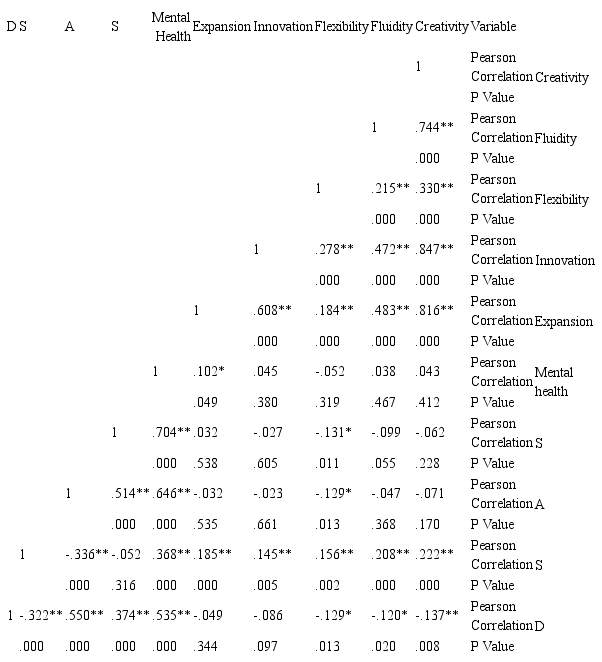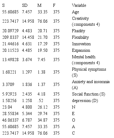 According to table 4: the correlation between creativity (four factors), and mental health component including (social functioning and depression) and significant, respectively is %22.2, - %13.7 the correlation coefficient between the fluency and the mental health component including (social functioning and depression) and significant, respectively is %20.8, - %12 The correlation between flexibility and mental health components including (physical symptoms, anxiety and insomnia, social functioning, and depression) and significant respectively is - %13.1, -%12.9, %15.6, - %12.9. The correlation between creativity (innovation) and mental health component (social functioning) of %14.5 is significant. The correlation between expansion and mental health component (social functioning) of %18.5 is significant. So according to this component was concluded between creativity and mental health component, there was a significant relationship and the correlation is negative except social function.