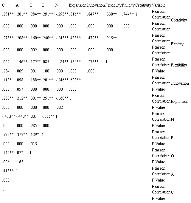 According to table 3: the correlation between Neuroticism and Creativity and its components (fluency, flexibility, innovation, expansion) is significant and respectively - %29.3, - %24.3, - %18.4, - %24.6, - %16. So the correlation between Neuroticism and Creativity and all four of its components is significant and negative. The correlation between Extraversion and Creativity and 3 of its components (fluency, innovation, expansion) is a significant and positive respectively %29.1, %24, %20.1, %25.1 . The correlation between Openness and Creativity and all four of its components (fluency, flexibility, innovation, expansion) is positive and significant and it is respectively is %28.4, %16, %17.2, %18.8, %30.1. The correlation between Agreeableness and Creativity and three of its components included with (fluency, flexibility, and expansion) is positive and significant and it is respectively %20.1, %20.8, %14.6, and % 21.2. The correlation between Conscientiousness and Creativity and to behave with three of its components, including (fluency, innovation, and expansion) is positive and significant and it is respectively %25.1, %27.3, %11.8, %23.2.