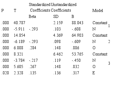 According to the table of coefficients, we have the following regression model: Extraversion (0.317)+Flexibility(0.832)+Neuroticism(o.45)–53.765 = Creativity.