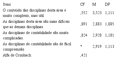 A dimensão quatro foi chamada de “Dificuldade percebida”, pois apresentaram em comum atitudes relacionadas a complexidade e a dificuldade nas disciplinas da área contábil.