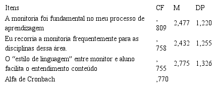 A dimensão cinco foi chamada de “Utilidade da monitoria”, por que as afirmativas mensuram a percepção dos discentes sob a ótica do quão útil é o ensino complementar. Nessa dimensão, foi percebida que na variável “O “estilo de linguagem” entre monitor e aluno facilita o entendimento do conteúdo” com maior média (M=2,775) apesar de ter sido a maior obteve um resultado de discordância sobre a assertiva, resultando que o estilo de linguagem entre o monitor e o aluno não facilitam os conteúdos, explicando que a monitoria não foi fundamental no seu processo de aprendizagem, assim como, também, não recorreram a monitoria para terem aulas complementares sobre as disciplinas de contabilidade, apesar de Santos (1998) refletir que as monitorias são de suma importância para o obtenção de maiores conhecimentos sobre a temática, tão como no processo de ensino aprendizado.