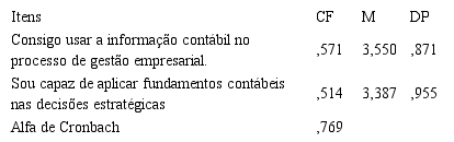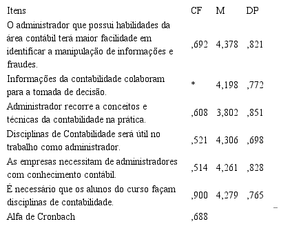 Tal fato é confirmado também na variável que possui menor média (M=3,802), “Administrador recorre a conceitos e técnicas da contabilidade na prática”, revelando a importância do ensino aprendizagem para o administrador e sua aplicabilidade na prática.