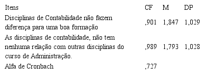 Em relação as médias, pode-se observar que prevaleceu a discordância total e parcial, entre as variáveis, “Disciplinas de Contabilidade não fazem diferença para uma boa formação”, e “As disciplinas de contabilidade, não tem nenhuma relação com outras disciplinas do curso de Administração” foram variáveis de caráter de negação.