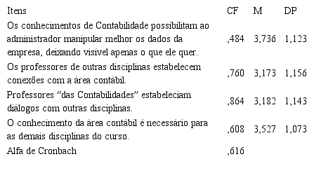 Onde obteve maior média com (M= 3,523) foi na variação “O conteúdo das disciplinas desta área é muito complexo, mas útil”, indicando a concordância parcial entre os discentes, ou seja, resultando que os discentes acham as disciplinas complexas, mas sabem da importância e da utilidade para sua profissão, pois para RAUPP et al. (2009) diz que as disciplinas de contabilidade são essenciais para a vida do administrador pois é na ciência contábil que será contada toda história da empresa, através dos registros dos atos e fatos contábeis.