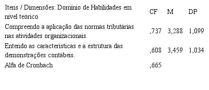 Na dimensão nove, foi denominado de Domínio de Habilidades em nível teórico, pois as variáveis apontavam a percepção quanto ao domínio teórico dos discentes em relação a área de contabilidade, tais como normas tributárias e estruturas das demonstrações contábeis.
