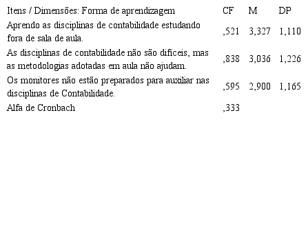 Na dimensão dez foi chamada de “Forma de aprendizagem” por que faz respeito a forma de aprender as disciplinas de contabilidade durante o curso. A variável que mais indicou concordância entre os discentes foi “Aprendo as disciplinas de contabilidade estudando fora de sala de aula” com média (M=3,327) isso quer dizer que a maioria dos discentes demonstra aprender mais sobre a contabilidade fora da sala de aula, seja com livros, vídeo aulas em suas residências ou até mesmo nas monitorias, pois a mesma, segundo resultado está preparado para auxiliar no aprendizado das disciplinas de contabilidade. Tal fato pode se dar devido às metodologias adotadas na sala de aula que não estão ajudando na forma de aprendizagem, assim como demonstra o grau de concordância.