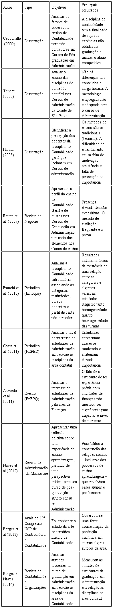 Infelizmente, estudos feitos sobre o tema acerca da temática “Ensino de Contabilidade” registraram números resultados abaixo do esperado de publicações para a área. Um levantamento bibliométrico e sociométrico feito por Borges e Naves (2014) demonstrou que a área é carente de estudos, mas existe o início de formação de algumas redes de colaboração entre pesquisados, o que contribui para o desenvolvimento da temática. Assim julgou-se interessante apresentar o que tem sido produzido na academia em termos de Ensino de Contabilidade para profissionais fora dessa área, como é o caso da presente pesquisa, graduandos em Administração.