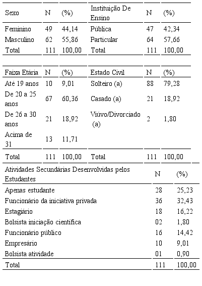 Conforme Tabela 1, a seguir, dos 111 respondentes retidos na amostra final, é observado uma paridade entre os sexos, com uma leve inclinação para o sexo masculino 62 (55.86%). Dos respondestes 67 (60.36%) tinham entre 20 e 25 anos de idade; 88 (79.28%) eram solteiros; 64 (57.66%) eram discentes de Instituições de Ensino Superior Particular; e, 36 (32.43%) tem como ocupação secundária serem funcionários iniciativa privada.