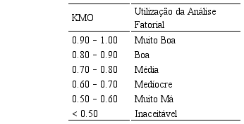 A adequação da amostra foi medida por meio do teste de Kaiser-Meyer-Olkin (KMO), sendo indicados valores acima de 0,50 como o mínimo aceitável nesse teste. Associado a isso, o teste de esfericidade de Bartlett indica a presença de correlações significantes entre os itens da escala, não devendo o teste de significância ultrapassar 0,05 (CORRAR et al., 2011). A medida de KMO pode ser interpretada como sendo uma correlação e por assim ser pode seguir o seguinte critério de classificação.