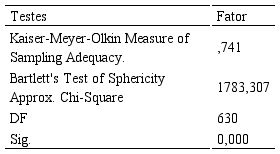No presente trabalho, verificou-se um KMO igual a 0,741, sendo classificado como médio o seu índice, aceitável para prosseguir com a análise de fatores (ver Tabela 2), indicando assim que pode-se prosseguir com a análise de fatores.
