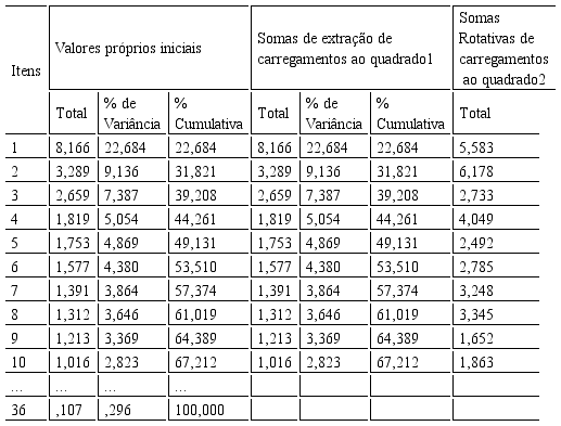 O primeiro fator explica 22,684% da variância de dados e, portanto, é o fator mais importante na explicação dos dados originais desta pesquisa. Os demais fatores têm, relativamente, menor importância em sumarizar as variáveis originais. Por exemplo, o último fator de dimensão, explica 2,823% da variabilidade dos dados. Juntos estes fatores explicam 67,212% das variações das medidas originais.