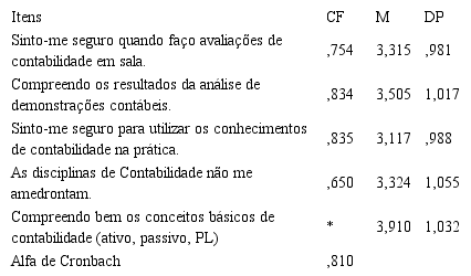 A variável “Compreendo bem os conceitos básicos de contabilidade (Ativo, passivo, PL) obteve maior média (M= 3,910) no fator de Confiança, indicando que os alunos possuem conhecimento básico teórico da contabilidade. Assim como na questão do discente “Compreendo os resultados da análise de demonstrações contábeis”. Isso quer dizer que os discentes estão mais interessados pelas disciplinas de contabilidades, devidas as fraudes evidenciadas na dimensão acima, como também sua importância na vida profissional.