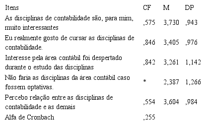 Assim como a alta representatividade na variável que diz “Eu realmente gosto de cursar as disciplinas de contabilidade”, fazendo com que se relacionem, onde além de achar a contabilidade interessante, também realmente gostam de cursá-las. Já em relação a menor média com (M=2,387), revela que mesmo que as disciplinas fossem optativas os discentes prefeririam cursá-las. Tal resultado pode estar ligado a importância e relevância da contabilidade na vida acadêmica do administrador.
