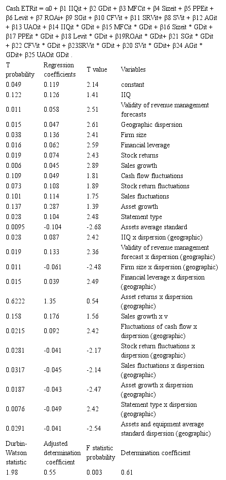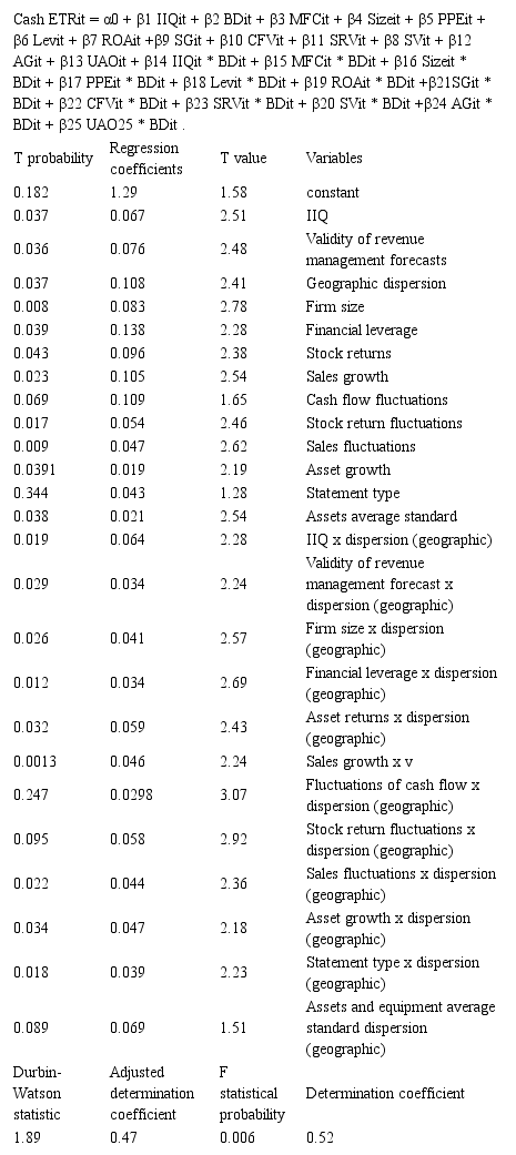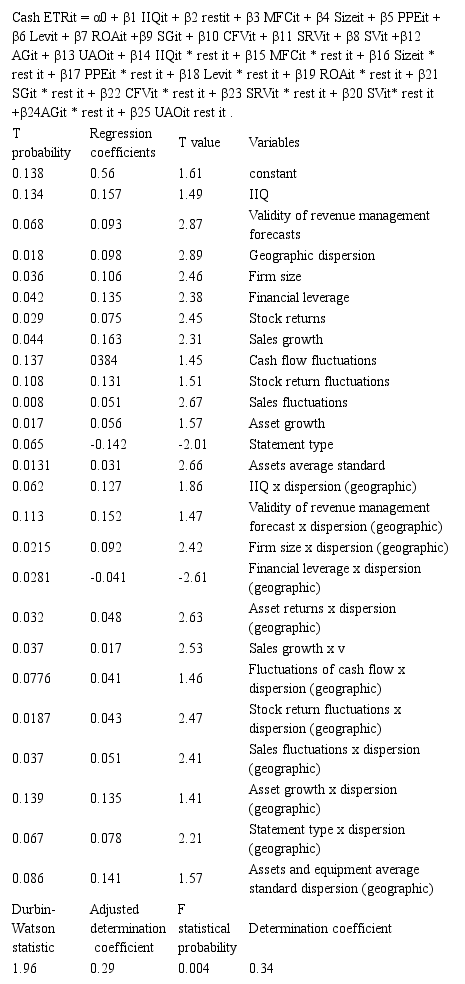 The combined regression model of constant effects of impact of high IIQ on tax avoidance under geographic dispersion is positive (0.087); and with respect to probability of t (0.028), it is statistically significant. This issue reveals that high IIQ under geographic dispersion results in tax avoidance. The effect of high IIQ despite the effect of geographic condition (0.126) and with respect to probability of t (0.122) is statistically insignificant on tax avoidance. In addition, validity of forecasts of management with respect to geographic conditions, has a significant (0.133) effect on tax avoidance considering the t value (0.019). Without the effects of geographic condition, this effect is still significant (0.058) with a t value of (0.011).