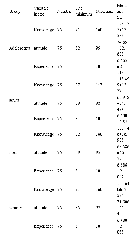 Descriptive data (mean ± SD) of three variables: knowledge, attitude and experience to distinguish the studied groups (youth, adults, men and women) are presented in Table 1. As shown in Table 1 the mean knowledge, attitude and experience in adolescents, respectively equals to 128.187±13.585, 74.065±12.623 and 6.565±2.118 and in the adults equals to 115.459±13.379, 65.918±14.474 and 6.500±1.98.also the mean of knowledge, attitude and experience in men equals to 120.146, 68.586±16.292 and 6.586±2.047 and women equals to 123.640±12.274, 71.506±11.490 and 6.480±2.055.