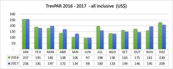 Após analisadas as variáveis, verificou-se que a receita média seguiu em direção contrária à taxa de ocupação, apresentando desempenho positivo no ano de 2017. A receita média de 2017 foi de US$ 269,53, perante US$ 264,81, obtida em 2016. Esses valores representam uma elevação de 1,78 % entre os anos. Esses valores representam ganho real nessa variável, já descontado o fator inflacionário. Esse ganho apresentou importante contraponto à queda da taxa de ocupação, ajudando a repor perdas geradas por esse último índice.