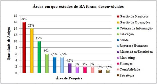 Após a tabulação dos dados, foi realizado o tratamento estatístico descritivo da amostra - distribuição de frequência e representação gráfica - o que possibilitou a identificação de características inerentes à amostra coletada, como por exemplo, as áreas de pesquisas relacionadas aos artigos selecionados (Figura 1). Dentre as áreas que demonstraram interesse por discutir BA, as de maior representatividade foram: gestão de negócios (24%), gestão de operações (21%), ciência da informação (15%), educação (ensino/pesquisa) (9%), recursos humanos (7,5%) e saúde (7,5%).