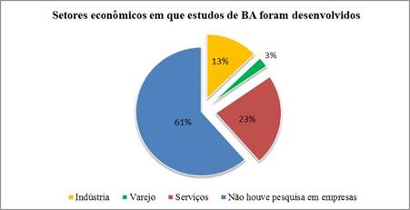 Quando analisados os contextos de pesquisa (Figura 2), constatou-se que 61% dos artigos não estavam relacionados a nenhum setor econômico, sendo resultado de esforços apenas de cunho teórico. Tal dado reflete a preocupação da comunidade científica em discutir aspectos relacionados a definições, abrangências e impactos de BA na organização. Os outros 39% dos artigos revelaram discussões teóricas ou empíricas com implicações nos setores da indústria, do varejo e de serviços.