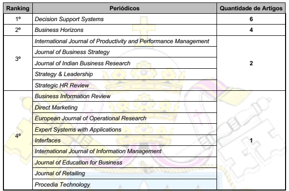 Vale ressaltar que dos 47 artigos selecionados para compor a base bibliométrica, 62% são provenientes de periódicos com alto fator de impacto, conforme classificação do JCR (do inglês, Journal Citation Reports). Não obstante, 38% dos trabalhos foram publicados em revistas especializadas de tecnologia e negócios - KMWorld, CRM Magazine, BizEd Magazine, MIT Technology Review, Computerworld e Information Today. Nestas revistas, por sua vez, comumente relatou-se o uso de tecnologias e experiências de corporações que adotaram a abordagem analítica em suas estratégias operacionais e as implicações decorrentes.