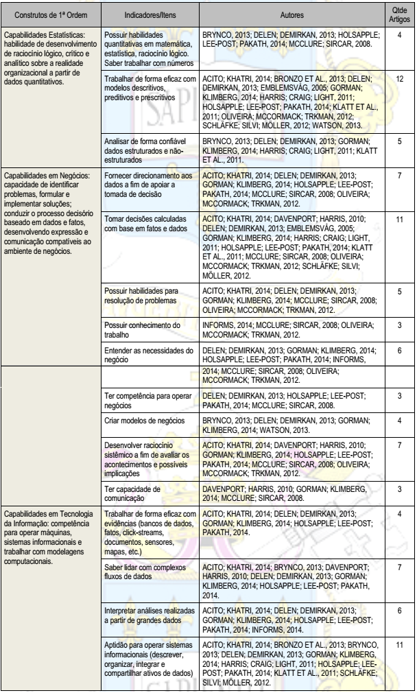 Finalmente, a partir do mapeamento realizado, verificou-se que os respectivos indicadores (Figura 6) podem ser sistematicamente agrupados em três grandes dimensões basilares (ou construtos de primeira ordem), a saber: capabilidades estatísticas (referente à habilidade de desenvolvimento de raciocínio lógico, crítico e analítico sobre a realidade organizacional a partir de dados quantitativos); capabilidades em negócios (inerente à capacidade de identificar problemas, formular e implantar soluções; conduzir o processo decisório a partir de dados e fatos, desenvolvendo expressão e comunicação compatíveis ao ambiente de negócios); e capabilidades em tecnologia da informação (relacionado à competência para operar máquinas, sistemas informacionais, e trabalhar com modelagens computacionais), que por sua vez são responsáveis pela formação e medição do construto de segunda ordem CA.