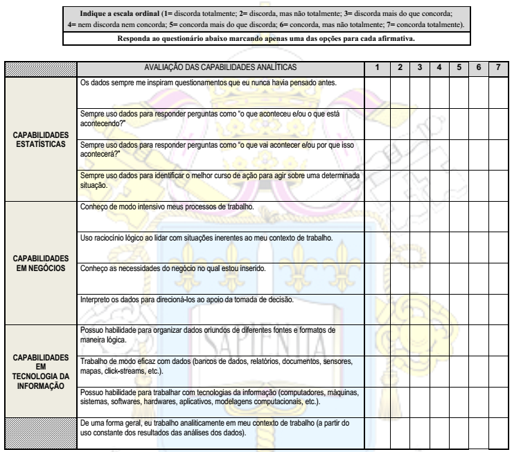 Com base em tais resultados foi proposto um questionário que utiliza uma escala do tipo Likert de sete pontos, variando de 1 (um) discordo totalmente a 7 (sete) concordo totalmente (Apêndice A), para avaliar o potencial das empresas em explorar BA.