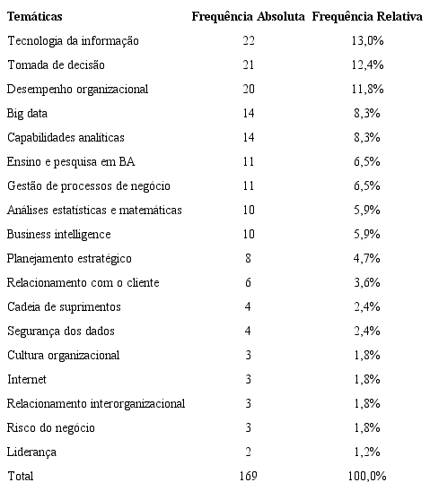 Com base na análise da Tabela 1 que apresenta as temáticas de maior frequência verificadas nos artigos sobre BA, depreende-se que elas além de estarem alinhadas a diferentes objetivos na aplicação de BA, também fazem referência a aspectos relacionados ao seu processo de desenvolvimento e articulação na rotina empresarial.