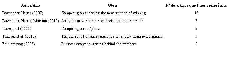 A seguir procedeu-se a análise das referências de cada artigo, identificando as obras que os autores mais se basearam para a elaboração de suas pesquisas (Tabela 2). Pôde-se constatar que a obra considerada seminal para a discussão de BA é o livro de Thomas Davenport e Jeanne Harris (2007) intitulado de Competing on analytics: the new science of winning, procedida de um artigo mais recente (2010) dos mesmos autores em coautoria com Robert Morison sob o título Analytics at work: smarter decisions, better results. As obras possibilitaram o despertar do público para a importância da discussão da abordagem analítica nos estudos de gestão e negócios. Tal fato demonstra-se verídico, pois atualmente nos EUA (BizEd, 2013, 2014; Brynco, 2013; Mcclure & Sircar, 2008; Watson, 2013) e no Brasil (Sincorá et al., 2016), vem crescendo o número de cursos de graduação, MBA’s e mestrados profissionais para formação de mão-de-obra qualificada em BA.