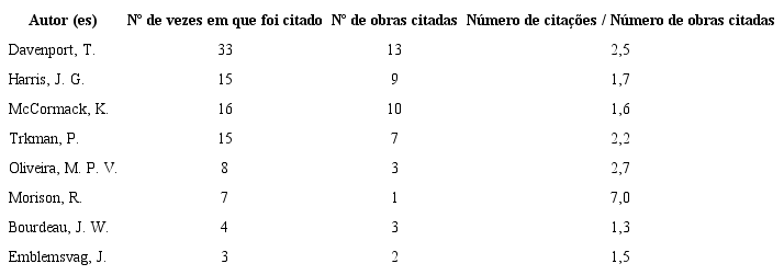 Outra análise realizada refere-se ao mapeamento dos pesquisadores que desenvolveram estudos sobre BA, destacando-se aqueles mais citados por outros pesquisadores da comunidade científica. Dessa maneira, é possível notar a importância dos referidos autores e de seus achados científicos para a evolução e desenvolvimento do campo de pesquisa. Observa-se na Tabela 3, que entre os pesquisadores com maior número de citações no período analisado (2004 a 2016), destaca-se Thomas Davenport, relacionado 33 vezes contribuindo para o estudo de BA com 13 obras, seguido por Jeanne Harris, na conceituação e explanação dos benefícios inerentes à adoção da orientação analítica nas empresas.