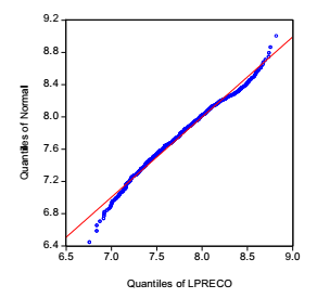 Quanto à presença de autocorrelação dos resíduos, embora não seja usual para dados em corte seccional (Gujarati, 2006), aplicou-se o teste de Durbin-Watson. Inserindo-se um componente autoregressivo de preço de apólice de seguros (AR (1)), cujo coeficiente se mostrou significativo a 1%, obteve-se como estatística do teste 1,98, que se encontra dentro dos limites da região de rejeição dessa hipótese, concluindo-se que há ausência de autocorrelação dos resíduos.