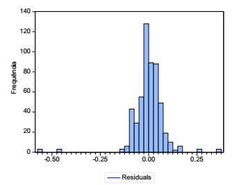 O histograma dos resíduos (Figura 5) aponta nessa direção, ainda que o teste de Jarque-Bera tenha rejeitado a hipótese nula de normalidade dos erros (estatística JB = 8020,031, com probabilidade de significância de zero, rejeitando-se a hipótese nula de normalidade). Mesmo que essa hipótese não seja validada, ainda assim é possível tratar os dados em situação de normalidade quando se tem uma amostra grande o suficiente para valer a Lei dos Grandes Números (Hair, Black, Babin, Anderson, & Tatham, 2009).