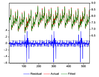 Com base nisso, a Figura 6 mostra o ajuste da regressão aos valores observados do preço de apólices de seguros automotivos (linhas verde e vermelha), além dos resíduos da regressão (linha azul). Esse gráfico observa a existência de um bom ajuste da regressão aos dados em grande parte do período analisado. Quanto mais a linha verde se sobrepuser à vermelha, mais ajustada será a equação estimada, ou seja, maior será a descrição da série observada. Dada a sua significância, os resultados do modelo final estimado são apresentados na Tabela 3, a seguir: