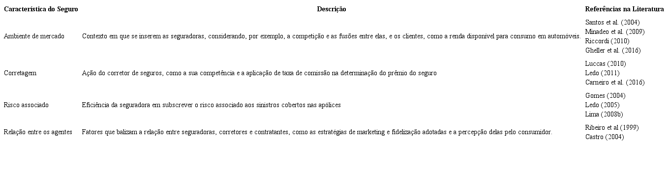 Dessa forma, são muitos os fatores que podem, dos pontos de vista econômico e humano, serem investigados no processo de precificação dos seguros, por exemplo, sob a forma de modelos estatísticos. Vieira et al. (2009), por exemplo, tiveram como variáveis básicas características do veículo, como preço de venda, marca e difusão, enquanto, para Castro (2004), seriam relevantes a qualidade no atendimento, a marca, o preço e a comissão paga. Assim se propõe também neste estudo, com base nessas diferentes fontes de discussão, como forma de abordar a temática dos seguros olhando tanto para seguradora quanto para o segurado.