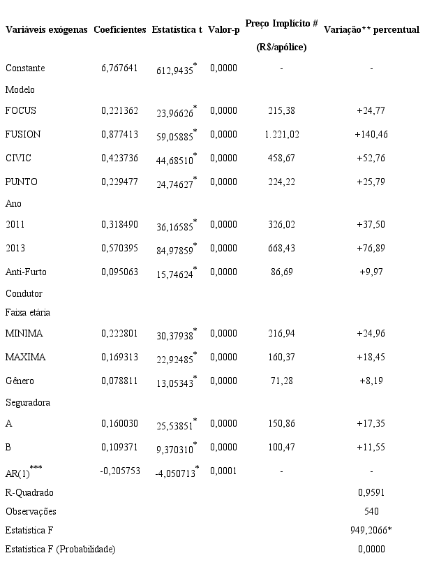 Portanto, por meio da equação especificada, é possível de se obter, a partir dos coeficientes resultantes, o preço implícito de cada característica de qualidade ou atributo (no presente trabalho, representadas pelas variáveis explicativas do modelo, apresentadas acima); logo tem-se um conhecimento de quais características influenciam em maior ou menor grau o preço de apólices de seguros automotivos, considerando-se a amostra fornecida.