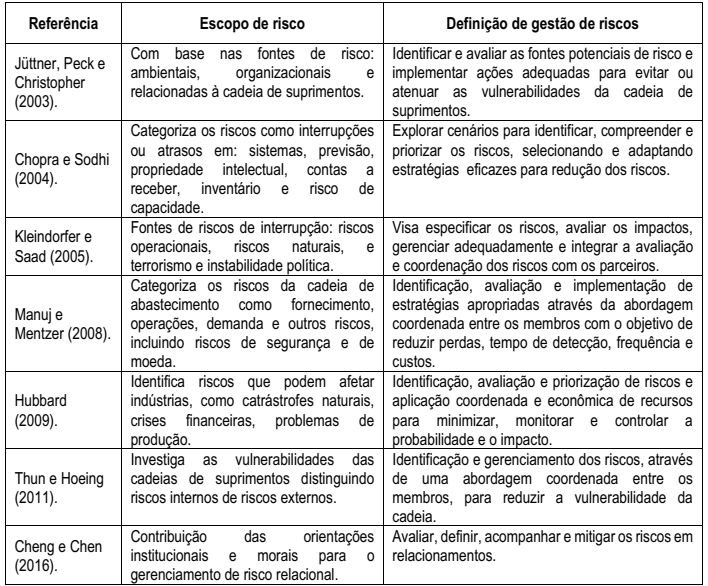A gestão de riscos na cadeia de suprimentos (SCRM) envolve a identificação, avaliação e controle dos riscos internos/externos que podem afetar o desempenho da cadeia por meio da aplicação coordenada e econômica dos recursos para minimizar, monitorar e controlar a probabilidade ou impacto dos acontecimentos que possam interferir na cadeia como um todo (Jüttner et al., 2003). A ISO (2015, p. 4) define gestão de riscos “como o mapeamento estruturado dos riscos inerentes ao negócio, contendo quatro elementos: fontes, eventos, causas e consequências”.