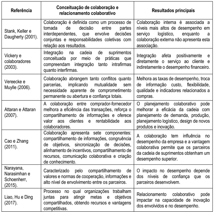 A colaboração entre organizações representa um campo de pesquisa estabelecido na literatura acerca da gestão de redes e cadeias de suprimentos (Cao, & Zhang, 2011; Castro, Bronzo, Resende, & Oliveira, 2015). Entre os aspectos estudados estão os fatores de sucesso dos relacionamentos, contribuindo para ganhos múltiplos, por parte tanto do fornecedor quanto do comprador.