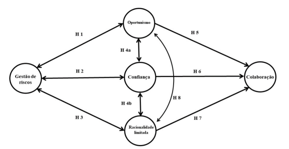 A sétima hipótese propõe uma relação negativa entre racionalidade limitada e colaboração. O fato de não ter as informações por parte do parceiro pode prejudicar a racionalidade da empresa e o processo de decisão; desse modo, a racionalidade limitada tende a reduzir a capacidade de os parceiros colaborarem entre si. Por fim, a oitava e última hipótese aponta para uma relação positiva entre oportunismo e racionalidade limitada. Adicionalmente poderia testar a relação indireta entre gestão de risco relacionais e colaboração mediada por confiança, oportunismo e racionalidade limitada.