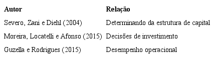 Machado et al. (2015) tem como objetivo verificar a efetiva interferência da estrutura de capital no desempenho das firmas brasileiras listadas na BM&FBovespa. Para isso, utilizaram como variáveis de desempenho das empresas o valor de mercado, o retorno sobre os ativos, o retorno sobre o patrimônio, a margem líquida, a liquidez geral e corrente e o q de Tobin. Nessa pesquisa, concluíram que apenas a liquidez geral e o q de Tobin são significativamente explicativos ao demonstrar uma correlação negativa entre endividamento e desempenho.