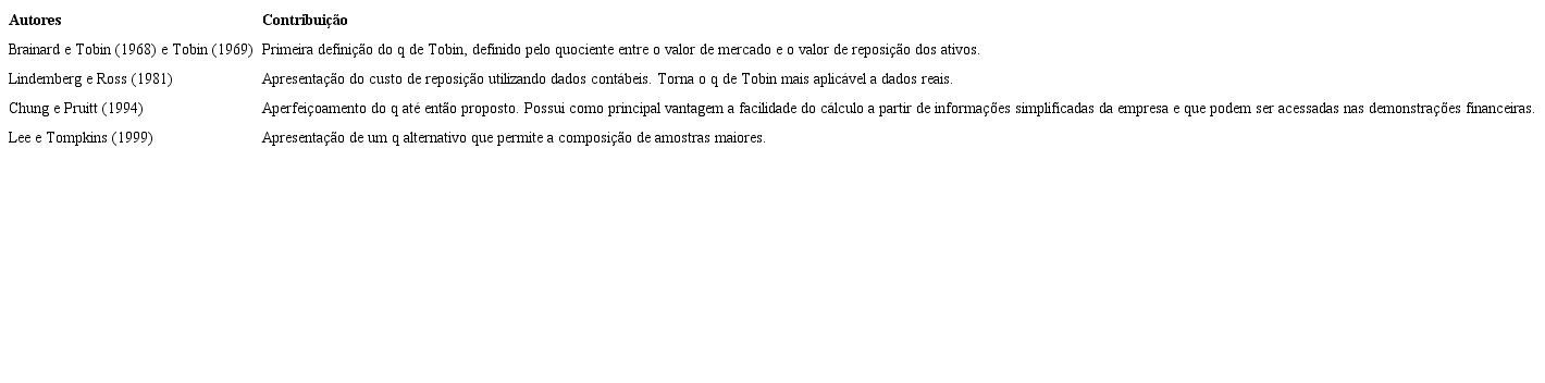 Com a evolução na forma de calcular o q de Tobin, a quantidade de trabalhos com esse tema foi aumentando, conforme visto, o que demonstra a importância do processo de construção desse conceito. Diante dessa importância, é apresenta, na Tabela 2, uma síntese dos estudos a respeito dessa temática e como o q de Tobin foi definido ao longo do tempo.