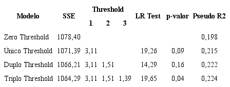 Observa-se, na Tabela 3, que o único teste para parâmetros threshold significativo foi para três parâmetros threshold (p-valor = 0,04). Para um e dois parâmetros, o p-valor encontrado foi 0,09 e 0,16 respectivamente, portanto, não são considerados significativos. Observando a soma do quadrado dos erros (SSE), verifica-se que o modelo com três parâmetros é o que minimiza o erro.