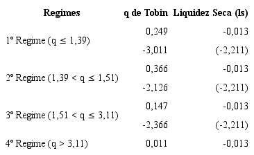 A Tabela 4 apresenta os coeficientes do modelo em painel de dados com três threshold, ou seja, com quatro regimes distintos. Observa-se que, para a variável liquidez seca, os coeficientes são negativos em todos os regimes, indicando que um aumento no índice de liquidez seca ocasiona uma significativa redução no Capex. Verifica-se, ainda, que, para os três primeiros regimes, o coeficiente do q de Tobin é positivo, e o maior impacto é verificado no segundo regime. Evidencia-se, também, que, no quarto regime, o coeficiente não apresenta significância estatística, ou seja, apenas no intervalo q >3,11 o q de Tobin não pode ser considerado uma variável explicativa para o investimento nas empresas brasileiras. No intervalo em que o q é significativo, um aumento no valor do q de Tobin representa também um aumento na variável Capex, ao contrário do que acontece com a variável liquidez seca.